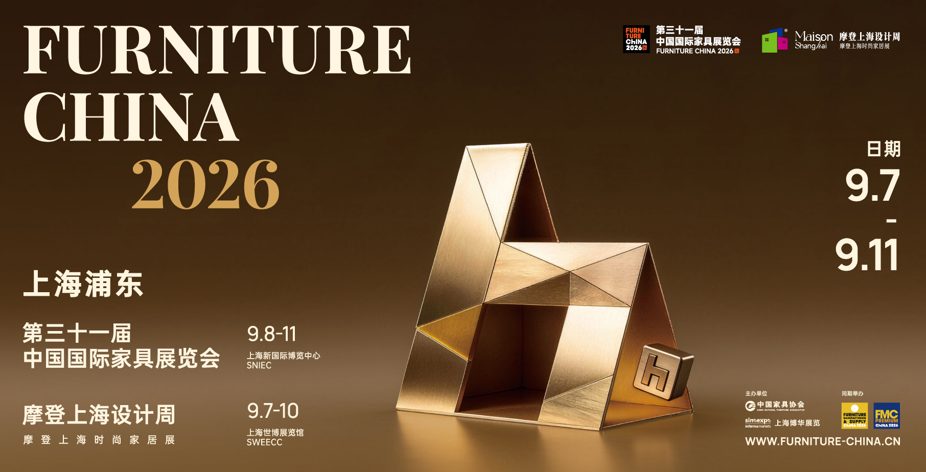 2026中国家具高端制造展/ 中国国际家具配件及材料精品展(FMC China 2026 /FMC Premium 2026)与第三十一届中国国际家具展览会同期举办,将于9月8-11日在上海浦东新国际博览中心举办;以产业优势布局家具业,汇聚一站式家具上下游资源,汇集行业中的龙头品牌和高端展品,展示新技术、产品和解决方案,以辅料、半成品、会议、活动全方位角度来诠释产业链的凝聚力和创造力,为家具生产、装饰装潢、工程应用领域提供精良装备和材料,助力中国家具产业迈向高端制造之路。