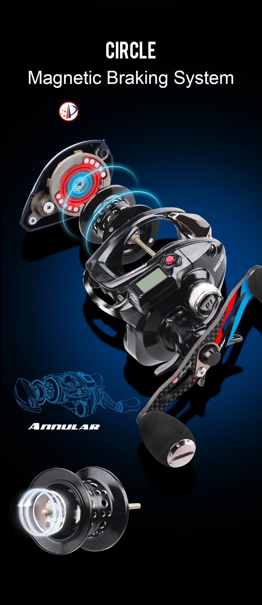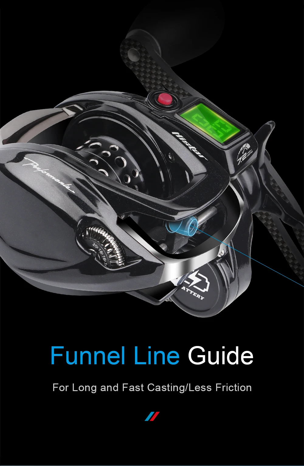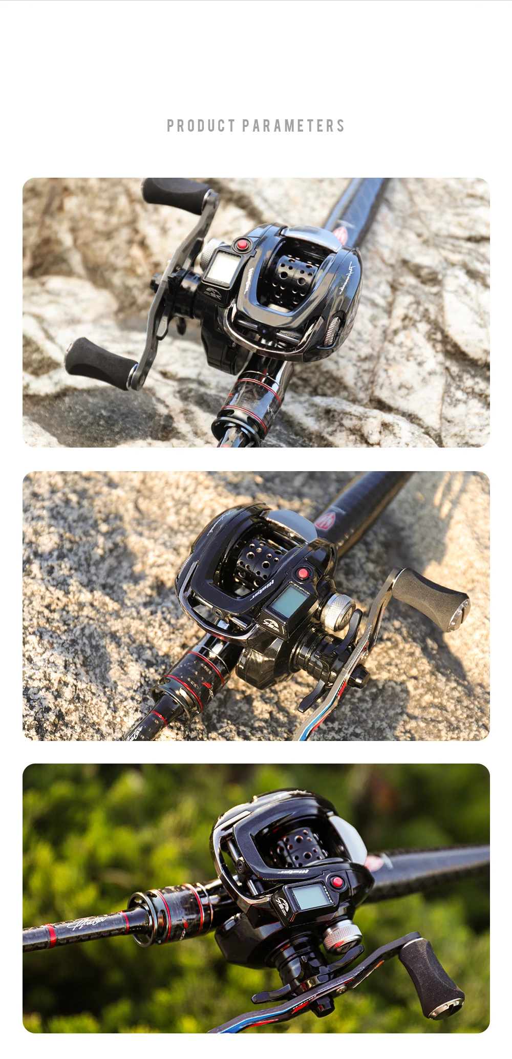 Features:1.Funnel Big Line Guide For Long And Fast Casting And Less Line Friction 2.Carbon Fiber Reel Leg: Light Weight & Sturdy For Big Fishes 3.Ultra Light Carbon Fiber Material Body For More Durable 4.3D Fashion LED Backlight Digital Display Screen For Fishing At Night 5.Digital Screen’s Function: Record The Number of Outgoing Meters For Fishing Lure Casting Distance/Vertical Measurement Of Water Depth Display Real Casting Speed Master The Flying Of Lures And Enjoy Lure Fishing Spool Matching With Centrifuge Device For Braking 6.Circle Magnetic Braking System For Stable Casting 7.20 Levels for Micro Magnetic Button Adjustment 8.Beginner Mode/Normal Mode/Advanced Mode Three Working Model Meet Your Demands 9.7.2:1 High Ratio For More Catching 10.8G Super Drag Power11.Detachable Battery