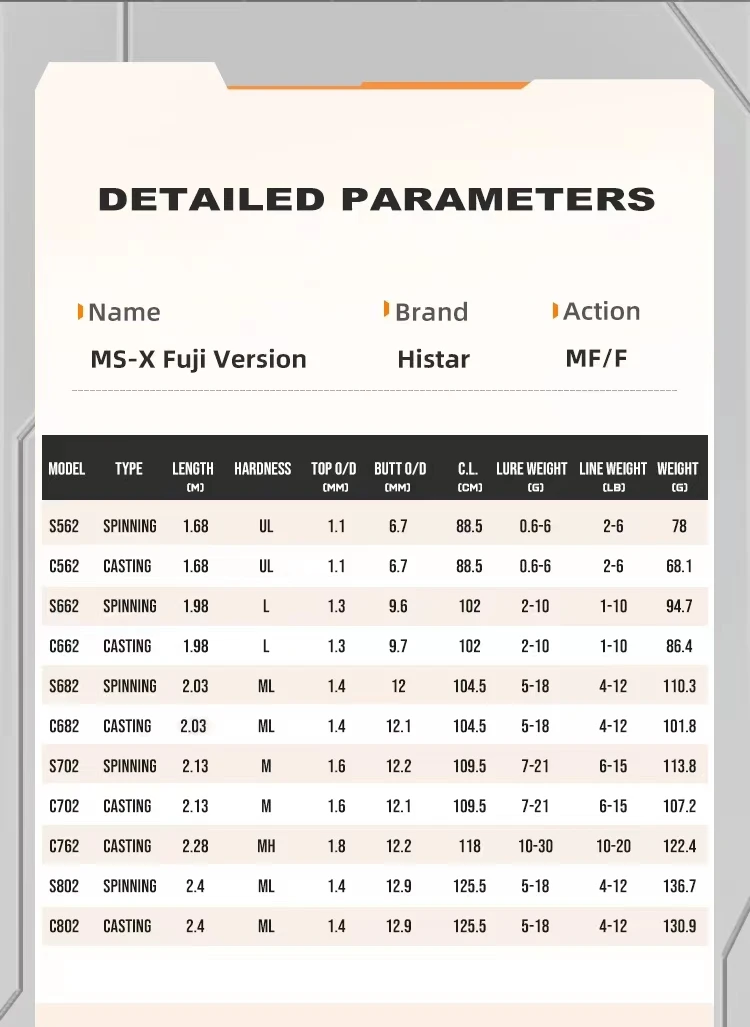 MODEL | TYPE | LENGTH(M) | HARDNESS | TOP O/D(MM) | BUTT O/D(MM) | C.L.(CM) | LURE WEIGHT(G) | LINE WEIGHT(LB) | WEIGHT(G) |